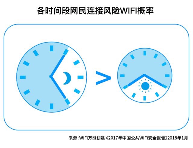 全天24小时,用户连接风险WiFi更容易发生在夜晚时段。 六、安全专家建议 尽管WiFi风险热点比例不足百分之一,且中高危风险热点占比极低,但由于WiFi连网的用户基数庞大、频次较高,因此,专家仍然建议用户谨慎对待。
