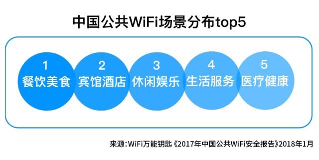 全国各省份中,广东省的风险热点数量最多,其次是浙江省和四川省。值得注意的是,广东省的WiFi热点数占全国热点总量比例也是最高。 四、中国公共WiFi场景大数据 4.1中国公共WiFi六成在餐厅和酒店