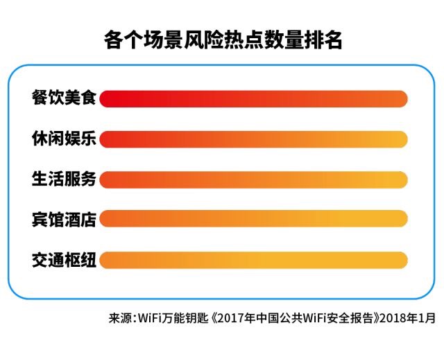 各类商业场景中,餐饮美食和宾馆酒店场景下的WiFi数量占比最高,分别达到32%和29%,休闲娱乐场所位列第三,占比13%。其他较为优质的商业场景还包括生活服务、医疗健康、文化教育与交通枢纽。 用户在餐饮美食场景下连接WiFi热点的频次最高,尤其是在用餐高峰时段。因此,一旦餐饮美食商户提供的WiFi热点存在不稳定、网速慢等现象,用户将第一时间有所感知,高用户需求倒逼餐饮美食类商户提供更优质的WiFi服务。 相比之下,用户处于宾馆酒店场景时,连接WiFi的时长最长,主要集中在夜间时段。WiFi质量已成为酒店整体服务的多项衡量标准之一,便捷、高速的WiFi服务有助于酒店集团吸引更多用户入住,在质量和安全方面都有较高保障。 4.2风险WiFi中餐饮美食类热点占比最高
