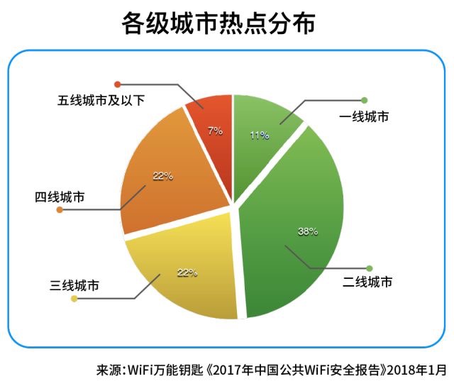 WiFi万能钥匙热点大数据显示,二线以上城市的热点占比达到49%。其中,一线城市包括北京、上海、广州、深圳;二线城市包括天津、重庆、杭州、南京、济南、青岛、大连、宁波等33个城市;三线城市包括贵阳、海口、银川、西宁、呼和浩特等61个城市;四线及以下城市包括219个城市。 这与城市的商业发展和人口聚集紧密相关。过去30年,随着国民经济的快速发展和城市化进程的推进,北上广深与各个省会城市发展出各类型商业形态,而WiFi作为居民消费的刚需,已逐渐成为各个商业中心的标准配置。因此,商业发展越密集,WiFi热点规模越大。 和去年同期相比,四五线城市热点数量增速明显。作为新兴潜力市场,三线及以下城市正在迅猛发展,各类实体零售店也陆续渠道下沉,未来,中小城市将成为热点拓展的主力方向。 3.2 相比三线以下城市,一二线城市WiFi更安全