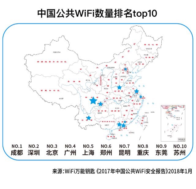 一线城市的风险WiFi比例为0.81%,二线城市风险WiFi比例为0.82%,低于全国风险WiFi比例的;相比之下,三线及以下城市的风险WiFi比例较平均值更高。 相比三线及以下城市与乡镇居民,一二线城市居民与商户经营者有更多机会接触到网络安全资讯,进而不断提升网络安全意识和技能,对于网络欺诈等违法犯罪活动有较高的辨识和抵御能力,因此,风险WiFi在以上城市更难有容身之地。 3.3 成都热点数量位列全国第一