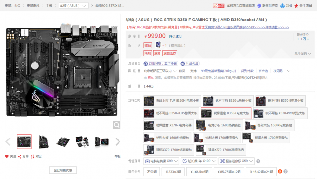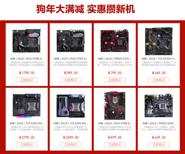在“狗年大满减 实惠攒新机”专区,华硕为大家推荐了八款热销产品,包括一款X370芯片组主板ROG STRIX X370-F GAMING,三款B350芯片组主板ROG STRIX B350-F GAMING、PRIME B350-PLUS、TUF B350M-PLUS GAMING,两款X299芯片组主板TUF X299 MARK 2、TUF X299 MARK 1,两款B250芯片组主板ROG STRIX B250H GAMING、PRIME B250M-D。