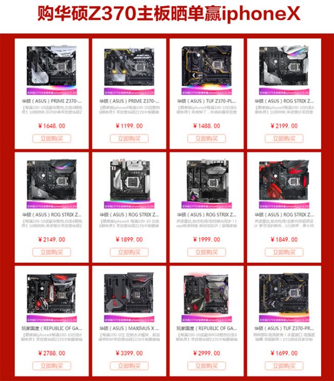 对于有意打造高性能Z370平台的玩家们来说,于2月28号之前购买任意一款华硕Z370芯片组主板,并于2018年3月10号之前提交15字中肯评价以及晒图3张,即可参加赢iPhoneX活动。 衷心希望大家踊跃参与一下,没准中奖的就有你!接下来,重点向大家推荐PRIME Z370-A与TUF Z370-PLUS GAMING这两款Z370人气主板。