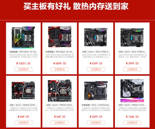 在“买主板有好礼 散热内存送到家”专区,华硕依旧为大家推荐了八款热销产品,包括四款X299芯片组主板ROG RAMPAGE VI EXTREME、ROG RAMPAGE VI APEX、ROG STRIX X299-XE GAMING、ROG STRIX X299-E GAMING,两款B250芯片组主板PRIME B250-PRO、PRIME B250M-PLUS,一款X370芯片组主板ROG CROSSHAIR VI HERO,一款Z370芯片组主板PRIME Z370-A。 板U套装 款款超值