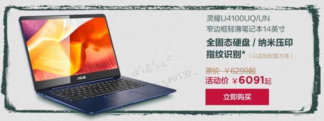 华硕商城“你开学,我放价”活动链接: http://store.asus.com.cn/article-huodongyeedm-467.html 活动期间,还有通用满2599减38元、满4999减108元、满6999减148元代金券可用,注册新会员立送5000积分(可抵扣50元),新会员注册成功截图发送至【ASUS华硕商城】微信号还可参与抽奖,关注ASUS华硕商城微信号参与游戏抽奖最高更可获得一等奖666元券、二等奖555元券、三等奖288元券、四等奖168元券、五等奖新年大礼包等多种福利,优惠多多。 全固态更轻薄 U4100UQ让你脱颖而出