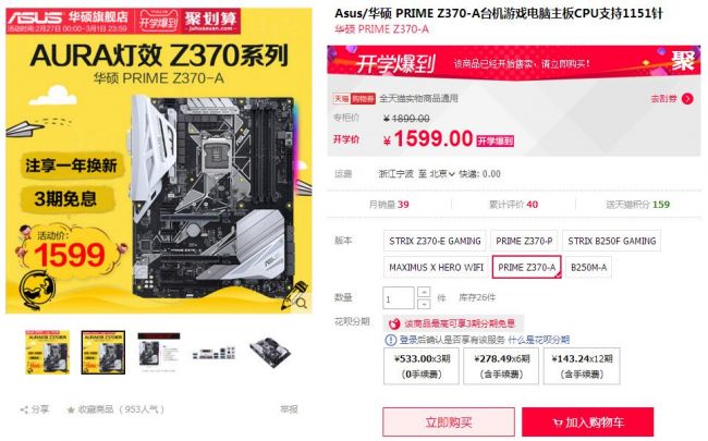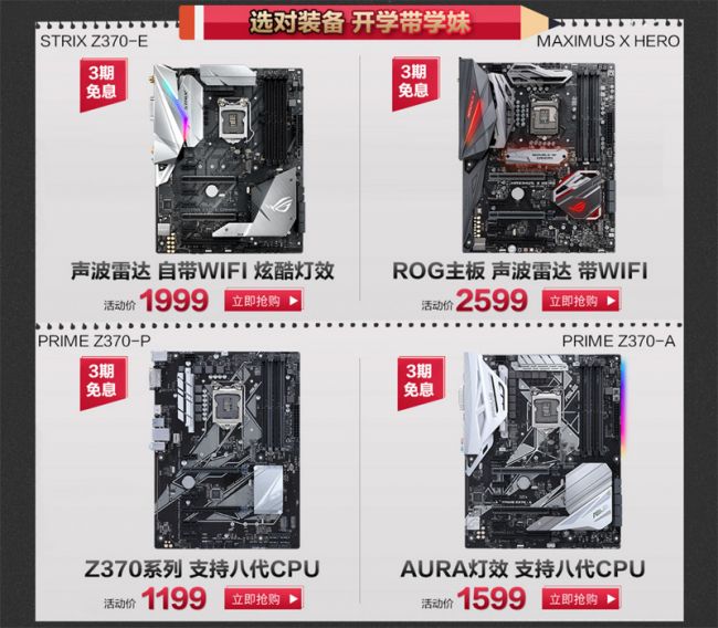 在“选择新装备 开启新学期”专区,华硕为大家推荐了两套板U组合:一套为ROG M10H主板搭配Core i7-8700K处理器,活动价仅为5849元;一套为PRIME Z370-P主板搭配Core i5-8400处理器,活动价仅为2599元。这些板U组合款款超值,并均享受3期免息活动,买到即是赚到! 选对装备 开学带学妹