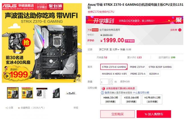 PRIME Z370-A是一款配置强悍、功能全面的Z370主板。凭借强劲的10相数字供电、华硕PRO CLOCK II技术、第三代T-TOPOLOGY设计、OptiMem内存优化设计以及5重优化等等,该主板可助力超频玩家挑战更高的频率,获得更强的性能。同时,它还拥有全面的散热设计,超大的MOSFET散热片,可选装风扇支架,让主板供电区域更加酷冷稳定。并板载M.2散热片,可有效为M.2 SSD降温,且还可通过华硕独家的3D打印模组安装散热风扇,保障设备的性能高效、稳定。此外,音频设计也是这款主板的一大亮点,它拥有华硕独有的美声大师3代技术,板载了新一代旗舰级S1220A音频芯片,可为用户提供媲美独立声卡级的音效享受。再加上炫酷的AURA RGB灯以及AURA SYNC神光同步技术,可让你的主机别具风 采。 华硕主板开学季京东促销同样劲爆:秒杀、满减、赠好礼 华硕主板此次于京东商城进行的开学季促销活动时间为3月1号。在这里,大家可享受到限时秒杀价、每满100最高减15元、赠送散热器等诸多福利。 跟天猫商城的活动一样,性能卓越的Z370电竞主板依旧是华硕此次京东商城开学季的促销主角。其中,PRIME Z370-A主板秒杀价仅1649元,并可叠加每满100减15元活动;TUF Z370-PLUS GAMING主板参加每满100减10元活动,并赠送玄冰400散热器;ROG STRIX Z370-E GAMING主板参加每满100减10元活动,并赠送玄冰GT散热器。