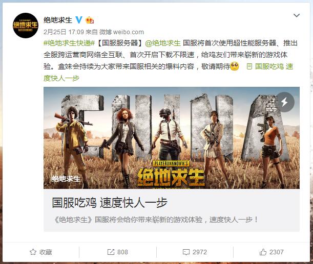 近日,《绝地求生》国服官方微博发布消息称,未来的国服将提供一流的网速,进而为国内的广大吃鸡玩家们带来崭新的游戏体验!