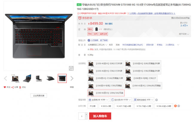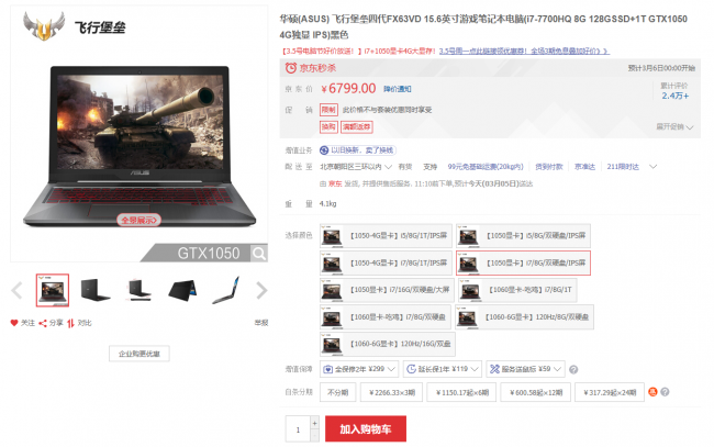 飞行堡垒FX63VM 购买链接:https://item.jd.com/6490781.html 实际价格请以页面为准,截图仅供参考 另外,FX63VM搭配第七代英特尔酷睿i5-7300HQ处理器,设备运行更快更稳定。更有16G DDR4内存,同时加载多种大型应用程序也不会卡顿!飞行堡垒FX63VM还配备HDD+SSD双硬盘存储模式,可支持128GB 固态硬盘与1TB机械硬盘组合,兼顾高速运行的同时保障海量存储,全方位提升游戏中的畅爽感受。这样的配置,能够超越市面上90%的笔记本电脑。 飞行堡垒FX63VD 强力攻击展现不凡 华硕飞行堡垒FX63VD搭载英特尔第七代酷睿i7-7700HQ处理器和NVIDIA GeForce GTX 1050独立显示芯片。英特尔酷睿七代的处理器能够大幅提升运算速度及数据处理能力,游戏过程中保障流畅的运行画面。在全高清画质模式下,运行主流电竞游戏性能超越普通PC性能数倍,让玩家可以畅享游戏特效全开的优质效果。