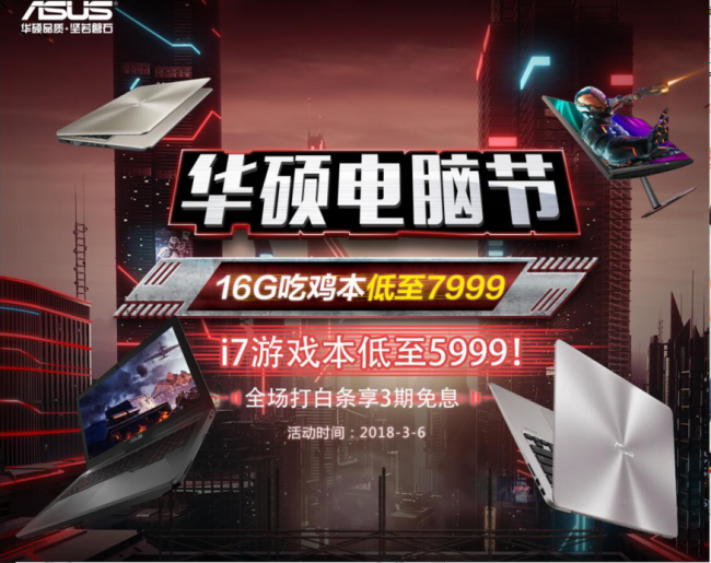 2018年3月6日,华硕电脑京东商城开启“华硕电脑节”狂欢活动。活动期间,多款性能强悍、外观时尚的笔记本电脑特惠促销,飞行堡垒吃鸡重装版标配16GB内存低至7999元;i7游戏本低至5999元。想畅快“吃鸡”千万不要错过这波华硕商城的大福利!