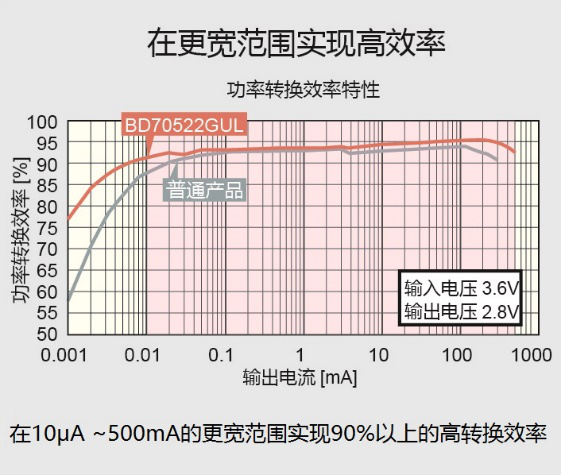 2.在更宽的负载电流范围实现高效率 内置低损耗MOSFET,负载模式搭载根据负载电流自动无缝切换的Seamless Switching Mode Control (SSMC)功能,在消耗电流1µA以下的DC/DC转换器中,在业界最宽范围(10μA~500mA)实现90%以上的功率转换效率。 在众多电子设备和应用的不同状态下实现高效率的功率转换,有助于延长电池的驱动时间。 <关于Nano Energy技术> Nano Energy是在ROHM的垂直统合型生产体制下,融合“电路设计”、“布局”、“工艺”三大尖端模拟技术优势实现的超低消耗电流技术。有助于移动设备、可穿戴式设备及IoT设备等用蓄电池或小型电池驱动的电子设备的长时间驱动。 <应用例> ・可穿戴式设备、移动设备 ・电池驱动的IoT设备(传感器节点)、小型工业设备(报警器、警报设备、电子货架标签等) <其他产品规格数据>