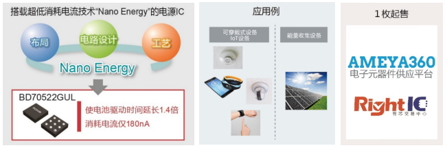 “BD70522GUL”是旨在实现IoT领域的关键词“纽扣电池10年驱动”开发而成的超低功耗电源IC。在ROHM的垂直统合型生产体制下,利用凝聚“电路设计”、“布局”、“工艺”三大尖端模拟技术优势而独创的Nano Energy技术,实现了世界最小的消耗电流180nA(n为10的负9次幂)。这使无负载时(应用待机时)的电池驱动时间比普通产品长1.4倍※,有助于CR2025等纽扣电池驱动的电子设备更长时间运行。此外,在业界最宽范围(10μA~500mA,从轻负载到最大负载)实现90%以上的功率转换效率。 本产品已于2017年10月开始出售样品(样品价格 300日元/个:不含税),并计划于2018年3月起暂以月产100万个的规模投入量产。前期工序的生产基地为ROHM滨松株式会社(日本滨松市),后期工序的生产基地为ROHM Apollo Co., Ltd.(日本行桥市)。另外,本新闻发布的同时,还将同步开始本产品“BD70522GUL”和搭载本产品的评估板“BD70522GUL-EVK-101”的网售,用户可从AMEYA360和Right IC两家网售平台购买。 今后,ROHM将继续开发运用模拟技术优势的高性能、高可靠性产品,为全社会的节能贡献力量。 <背景> 近年来,智能手机等移动设备、可穿戴式设备及IoT设备等用电池驱动的电子设备迅速普及。而且,为了提高产品的设计灵活度并确保配置新功能所用的空间,要求这些产品上搭载的元器件的功耗要降低到极限,以实现小型化并延长电池使用寿命。 一直以来,ROHM运用模拟设计技术和电源系统的工艺技术优势,并发挥垂直统合型生产体制的优势,致力于开发满足市场需求的电源IC。此次再次发挥这些优势,开发出搭载超低消耗电流技术“Nano Energy”的电源IC。