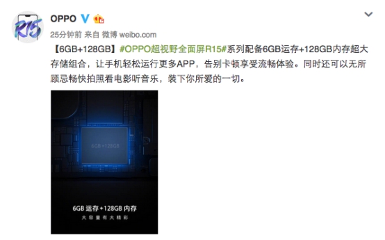今日, OPPO官方微博宣布,OPPO R15将配备6GB 运存+128GB内存组合,显示出强悍的“硬实力”。无论是运行APP,还是拍照、看电影、听音乐,OPPO R15都将为用户带来更酣畅的体验。