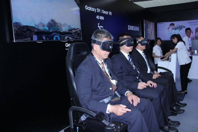 (讲师介绍产品) Gear VR,身临其境体验创新科技 在Gear VR展区,参观者还可以现场体验虚拟与现实的穿越,感受科技带来的奇妙旅程。通过VR头盔和摇摆座椅的结合,用户可以感受4D电影,体验VR游戏,配合手柄操作,让用户沉浸在虚拟环境中,身临其境感受黑科技的畅快体验。现场参观者跃跃欲试,纷纷体验刺激的银河攻击,沉浸式的虚拟现实游戏,给每位体验者带来前所未有的刺激体验。