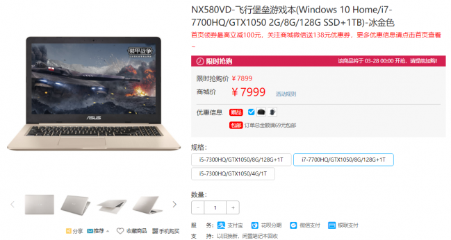 在外观上,华硕飞行堡垒NX580VD没有走酷炫游戏风格,而是采用了轻薄美观的优雅风格,更拥有金色机身外观,无论是淑女还是绅士都能轻松驾驭,高强度铝合金材质和拉发丝工艺彰显优雅华丽,机身轻薄约19.2mm,重量约为1.99kg,比一般的游戏本要轻薄很多。这种外观设计的好处在于,对于游戏玩家而言,性能方面是完全足够,而且轻薄的机身设计方便外出携带;对于一般用户而言,时尚轻薄的外观非常讨喜,强大的性能除了可以玩游戏,在剪辑视频、作图、设计的时候也能够轻松应对。 七代标压酷睿 更强悍的性能配置