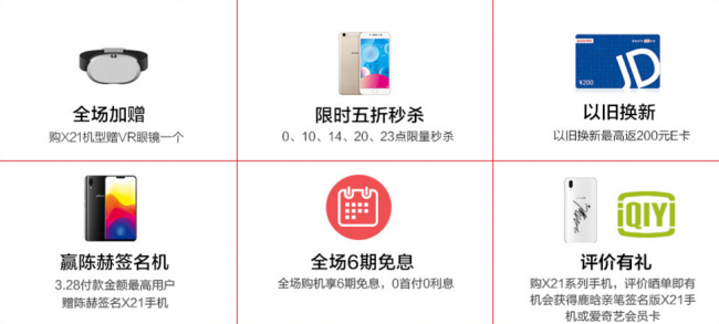 海量优惠福利 老用户专属福利 最高送陈赫签名vivo X21 此外,vivo还将以豪礼回馈忠实用户,超级品牌日当天付款金额最高的用户,立即赠送陈赫签名vivo X21手机。老用户购机或是团购2台手机以上,即可获赠vivo双肩背包。同时,vivo用户于3月24日至4月5日期间购买vivo X21,并在4月11前提交、完成旧手机回收订单,就有机会获得最高200元京东E卡,回馈力度相当不错。