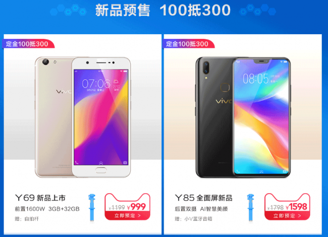 vivo 天猫超级品牌日多项福利 新品Y69、Y85也已开启预售,预交定金100元可抵300元,原价1199元的vivo Y69当天仅需999元即可入手,而全面屏新机Y85可1598元入手。超品日活动期间,全面屏爆款机型vivo X20直降200元,vivo X20Plus更是降价300元销售。同时还有多款机型可享受6期分期免息福利,购机无压力。