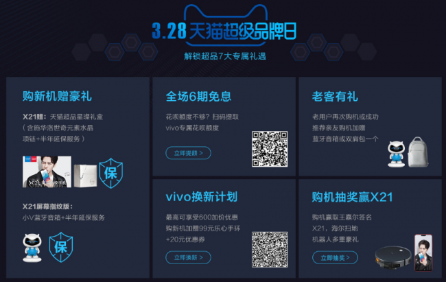 vivo X21新品 3.28vivo天猫超级品牌日 优惠不重样 除开新机抢购千元大礼包,vivo天猫超级品牌日更多礼惠也同步放送。当天在0点、10点、12点、15点、18点、21点、22点、23点参与整点购机活动,就有机会获得乐心手环、vivo双肩包、移动电源等优质周边产品。更有机会以2.1元的低价秒杀价值799元的Hi-Fi耳机,vivo X9爆款机型有机会999元秒杀,V粉们不容错过。