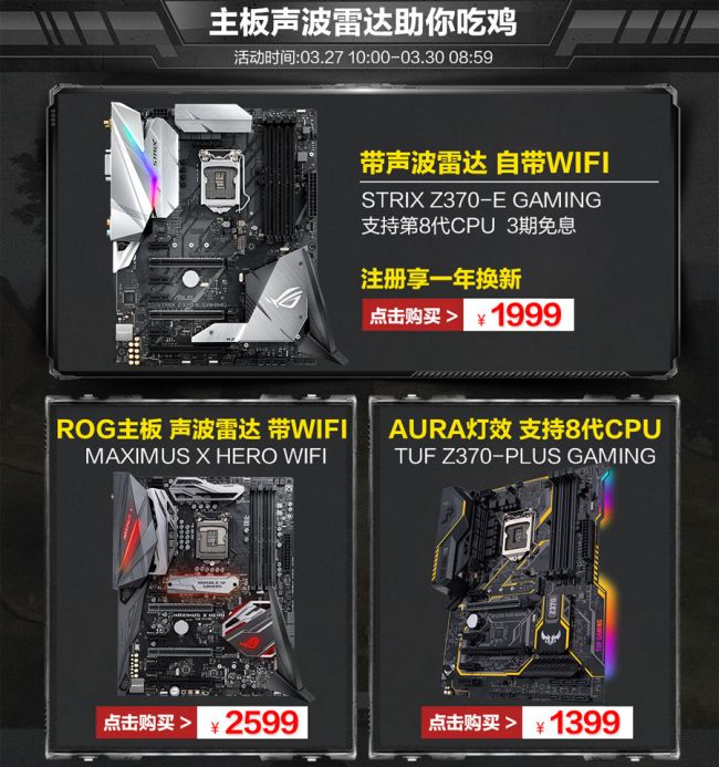 即日起至3月31号,华硕天猫旗舰店开启吃鸡日特惠活动,诸多热销电竞硬装纷纷让利促销。其中,华硕电竞主板此次让利幅度非常诱人,不仅拥有超低价格,而且部分型号还加送散热器等实惠好礼,近期有意升级吃鸡主机的玩家们一定不要错过哦! 华硕吃鸡日活动链接:https://asus.tmall.com/p/qm1.htm