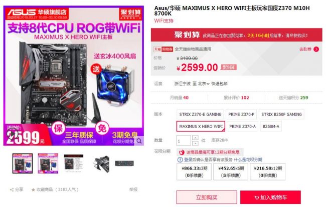 ROG MAXIMUS X HERO(WI-FI AC)主板隶属于ROG玩家国度系列,用料豪华,做工精湛,功能全面,在电竞游戏、超频、水冷、灯效等方面均能够提供卓越的性能,是高端玩家打造Z370电竞平台的优质之选。在这个吃鸡游戏火爆的时代,这款主板同样整合了一系列实用的吃鸡绝活,可助玩家们如虎添翼,赢得更多!凭借着强悍的10相数字供电、华硕独家的PRO CLOCK II 智能超频技术、新一代T-TOPOLOGY设计以及5重优化,该主板可助力超频爱好者挑战更高的频率,获得更强的吃鸡性能。对于水冷玩家们来说,这款主板还拥有强大的水冷控制区,可监测水冷散热器运行状态,自行调节,避免不断调试安装的困扰。加上美观而又高效的M.2散热片,可有效降低M.2 SSD的运行温度,以保障设备高效稳定地运行。作为一款ROG主板,炫酷迷人的ROG信仰灯也是不可或缺的,玩家可通过AURA专属软件进行灯效调节。同时,它还可与支持AURA SYNC神光同步技术的显卡、内存、键盘、鼠标、机箱、外接RGB灯带等设备联动,打造浑然一体的整机光效。 此次活动期间,ROG MAXIMUS X HERO(WI-FI AC)主板限时特惠价仅2599元,并且赠送玄冰400散热器一套。