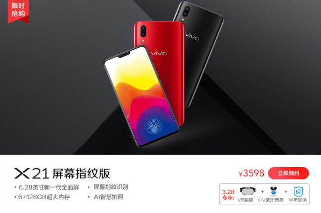 vivo X21屏幕指纹版(6+128GB)手机3598元,X21标准版6+128GB售价3198元,超品日活动专享VR眼镜、移动电源以及半年延保。 Y85、Y69首发 X20直降200元更实惠