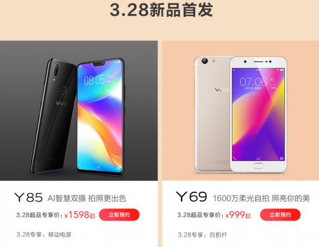 在vivo天猫超品日活动中,除了X21指纹识别版开售外,AI智慧双摄,拍照更出色的全面屏Y85跟1600万柔光自拍Y69同样正式上市,两款机型售价分贝为1598元跟999元,分别加赠移动电源跟自拍杆。