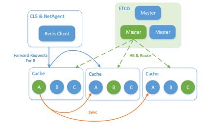 图1 架构图 图中的Master为集群的管理节点,每组Master管理一个地域的若干集群。 Cache则是实际的数据存储节点。架构中不再显式设置接入层,而是通过Cache转发用户请求,这样做的好处: · 单纯的存储或接入模块,由于对不同资源类型(CPU、网卡、内存等)需求的倾斜,无法很好的提高当前高配机型的设备利用率。也基于这个原因,理论上合并后的单层结构能更好的利用硬件资源,节约成本 · 减少模块数量可以减少大量运维操作,便于运维同学部署及规划资源等 · 路由更接近数据,因此在某台Cache上进行数据迁移动作时,可以更加实时的对用户请求做出应对(转发至最新的目标),减少变更对用户请求的影响 针对一些对于接入层有强需求的场景,比如,某业务的客户端链接数极多,我们也有针对性的做了优化。Cache可退化为纯接入机使用,这样可以方便的扩展为两层结构,统一使用一套代码,无需单独维护。 数据分布方面,采用了全部打散的方式,即在任意一台Cache上既有主数据也有(其他业务)备份数据,完全以Shard为粒度(物理内存单元)进行管理,如下图所示。