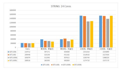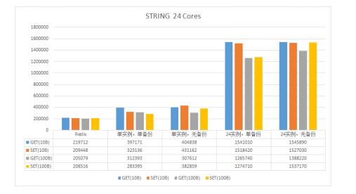 图6 线程模型 使用这种模式的主要考虑: · 具体内存的操作仅由某一个CPU处理,避免加锁,某个Shard出现热点时,对其他线程管理的实例影响较小 · 在管理实例数量不多的情况下,空闲CPU可以处理网络及磁盘IO,以及请求的编解码等工作,提高整机资源利用率 · 线程间不存在依赖或竞争关系,避免不必要的损耗 性能测试 性能应该是大家比较关注的部分,我们针对Redis的String与ZSet两种数据结构进行了性能测试,结果如下。 注: · "单实例"表示一台Cache仅管理1个Shard,"N实例"则表示同时管理N个Shard · 所有测试均使用2400个客户端对整台设备进行压测 · 测试不涉及消息转发,即客户端直接请求数据所在设备 · 测试样本分别使用10Byte与100Byte的数据 · 本次测试并未启用DPDK,后续会进行补充