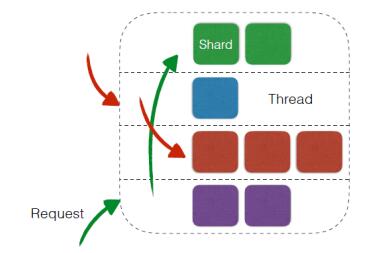 图5 使用率对比 测试结果显示,在简单String类型的场景下,两者存储量近似,但在稍复杂的结构中,CKV+则可以存储更多的用户数据。 大胆尝试,采用单进程多线程模型 对于内存数据库来说,高性能仍然是大前提,而开发过程中使用的线程模型及框架对于这个层面影响较大。因此在设计初始,我们对于这部分也做了大胆尝试。 首先,我们使用了单进程多线程的模式,而非大多开源系统的单进程单线程的路数,一方面可以更好的利用整机资源,另一方面也能降低运维门槛。对于多线程来说,需要解决的主要问题有如下几点: · 若干线程共同管理内存则势必需要引入锁,而高配机型核数多、线程多,加锁可能带来毛刺 · 单个进程需要管理多个业务数据,特别是主从版,每块内存Shard容量较大,难免有比较庞大的kv数据,同时主从版支持部分耗时操作,需要尽量减少实例间的相互影响 · 线程间通信或共享数据的代价要小,比如同步路由信息等 · 同时要考虑诸如线程上下文切换、CPU缓存命中率、IO等因素 在进行了一系列的调研工作后,最终确定线程模型为:每个物理核启动一个线程,管理若干内存Shard,如下图所示。