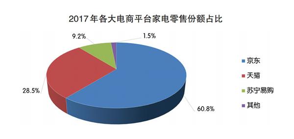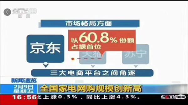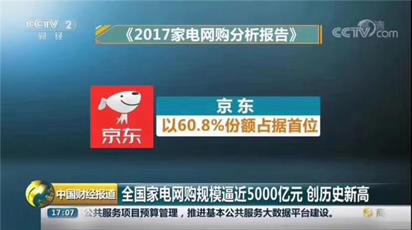 而京东家电作为我国全渠道最大家电零售商,在数据和用户覆盖上无疑有了先天优势。工信部赛迪研究院2月8日发布的《2017年家电网购分析报告》就证明着这一点:报告显示,2017年,我国B2C家电网购市场(含移动终端)规模达到4906亿元,同比增长27.6%。同时,家电网购渗透率已达26.5%,再创历史新高。其中,京东以60.8%的份额继续领跑市场,天猫排名第二占据28.5%,苏宁易购排名第三占据9.2%。前三强牢牢掌控中国家电网购市场98.5%的份额。CCTV财经和新闻两大央视频道也就全国家电网购规模创新高做出了相关报道,可见京东最大家电零售商的市场地位短时间内难以撼动。