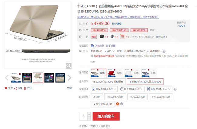 华硕A580UR京东购买链接:https://item.jd.com/19941117064.html 华硕A580UR的外观不仅触感精致,而且还设计了荣耀金、星空灰、激情红、雪山白多种颜色,贴心考虑到了年轻人时尚、潮流的个性需求。自重约2.3kg,薄约23.2mm,书包、挎包、公文包,一包hold住,轻装上阵,自信应对每天不同挑战。