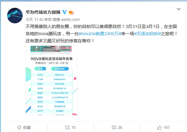 今天,华为在官微发布的一张海报引发了网友的广泛关注,通过这条微博我们了解到,在3月31日——4月1日期间,华为即将在全国各地近20个城市开启线下24h“nova潮玩店”。据悉,“nova潮玩店”是华为专为全国各地年轻潮流人群打造的一次潮流酷玩体验,通过“nova潮玩店”希望能够给全国各地的年轻潮流人群带来一次智慧化的潮流生活体验,炫出属于他们自己独一无二的freestyle。