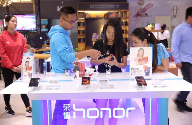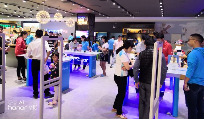 顾客在荣耀京东之家店内体验手机