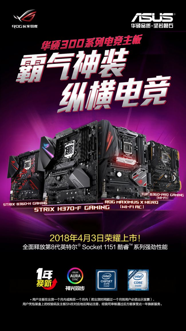 2018年4月3日,华硕率先推出了多款全新H370、B360和H310芯片组主板,可完美支持第八代智能英特尔酷睿台式机处理器。此次H370和B360主板新品包括玩家国度ROG STRIX猛禽系列、国民电竞利器TUF GAMING电竞特工系列和典范之作PRIME大师系列。华硕全系列H370/B360/H310主板拥有华硕诸多独家顶尖技术,提供无与伦比的卓越性能,完美释放处理器全部效能,给予玩家更快、更轻松、更身临其境的游戏新体验!