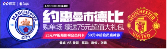 与此同时,经过crazy march的3月营销活动之后,PP体育4月又将重磅推出曼市德比专属会员活动。会员权益多多:1、活动期间只需购买单场曼市德比比赛,壕送75元超值大礼包(PP视频影视会员月卡+50元中超会员直减券)。2、本次曼市德比将由詹俊、张路两位一线解说大咖联袂解说。3、高清画质,会员免广告,会员道具玩转直播。优惠活动不停歇,针对本场比赛,PP体育更是将在4月4日-7日在官方微博(@PP体育)以及官方微信(搜索PP体育)推出线上抽奖活动,活动期间,为两队打call,同时将抽取2名球迷分别送曼切斯特双雄官方正版球衣一件。