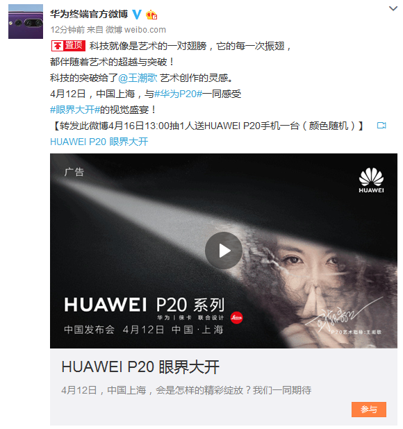 根据华为官方消息,继3月27日法国巴黎新品发布会之后,华为将于4月12日在上海举行国内发布会,正式向国内用户推出2018年度旗舰华为P20系列手机。并且,此次发布会将由国际知名艺术导演王潮歌担任艺术指导,这也是王潮歌导演首次跨界指导科技品牌的发布会,消息一经发布就引发了各界的广泛议论。