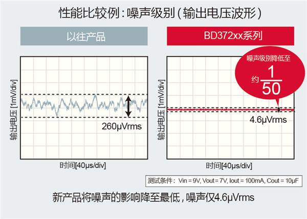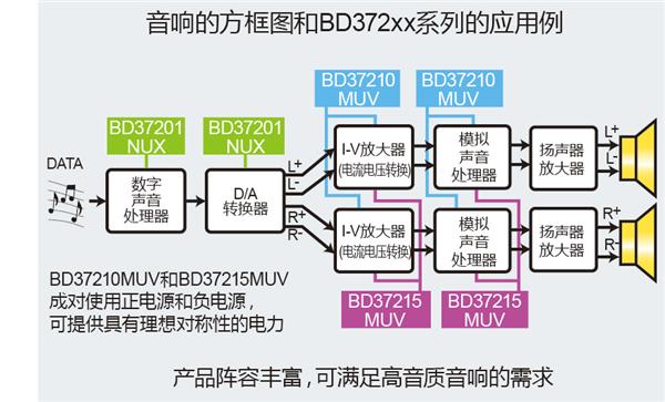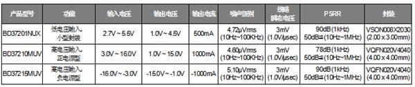 产品阵容包括:非常适用于在低电压下工作的数字器件(DA转换器、DSP等)的BD37201NUX、非常适用于在高电压或正负两个电源下工作的模拟器件(声音处理器、电流-电压转换放大器等)的BD37210MUV(正电源)和BD37215MUV(负电源)。未来还会在这些产品的基础上继续扩充产品阵容,强有力地支持音响设备的高音质化发展。