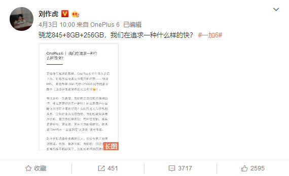 文中提到:“其实用户想要的,是更轻松高效自由的使用体验,也是一加一直追求的“无负担”使用体验。” 通过这条长微博,验证了一加6将搭配最顶尖高通骁龙845顶级处理器、8GB+256GB超大内存组合,满足快速流畅稳定的用户体验。同时,外界猜测其将会使用6.28英寸刘海式屏幕,屏幕比例为19:9,电池容量为3450mAh,支持Dash闪充。但对于价格问题,还得等待发布会之后才能得知。