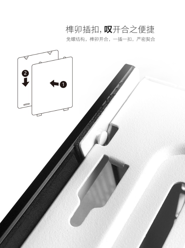 同样非常抢眼的还有这个榫卯插扣设计,如此一来就可以做到在免螺丝的情况下拆装玻璃和侧板了!