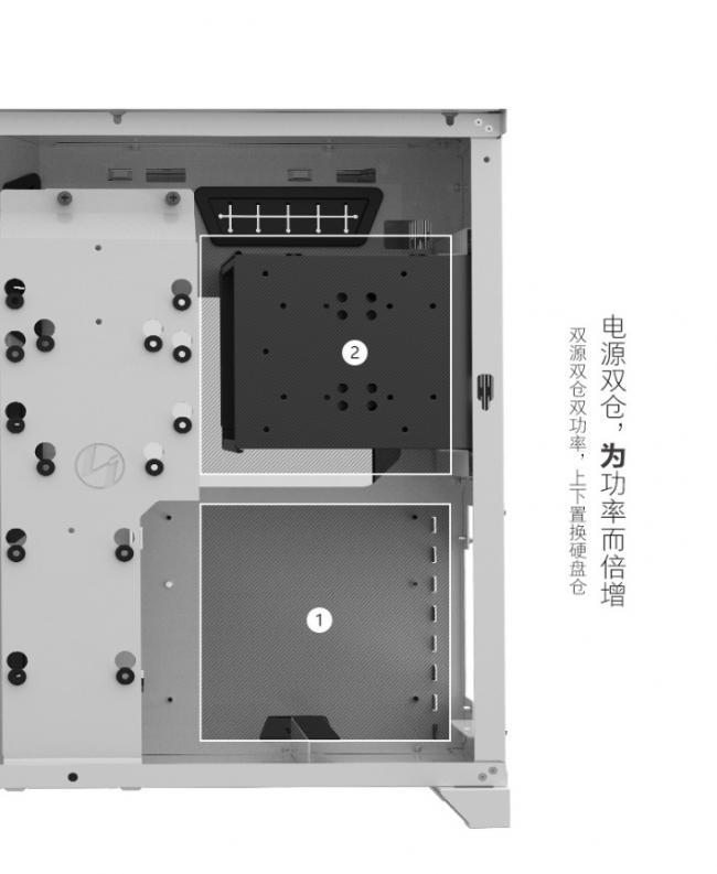 并且包豪斯-O11还可以同时装配两个ATX电源,满足你对供电的所有需求,你甚至可以用它来打造一个小型个人工作站,不过双电源方案下就需要移除整个3.5"硬盘架!