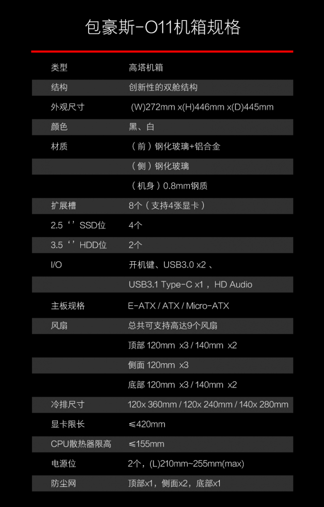 最后再给大家看看联力包豪斯-O11的具体规格,再放几张装机效果图给大家养养眼。