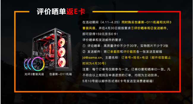感兴趣的朋友不妨马上关注并到京东购买!在4月11-25日期间同时购买包豪斯-O11和光环3套装风扇并评价晒单既可获得159元的京东E卡,同时在4月11-16日期间预付10元定金还可享定金抵100元的优惠!各位,机不可失啦!