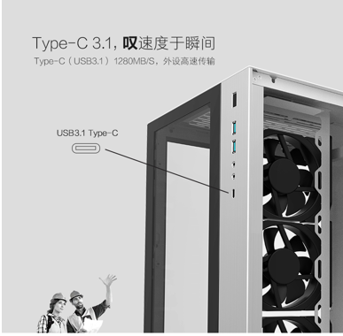 机箱前面板I/O方面最大的亮点无疑是这个USB3.1 Type-C接口,在硬件支持的情况下最高传输速率可达1280MB/s;除此之外还预留了两个USB3.0和一组3.5mm音频接口。