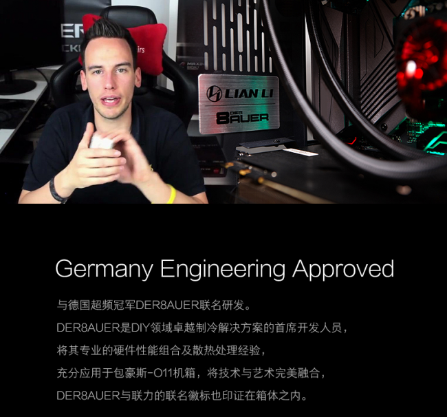 除此之外,联力方面还找来了德国超频冠军DER8AUER联名研发这款产品,结合DER8AUER专业的硬件性能组合及散热处理经验,充分应用到包豪斯-O11的设计中,以达到真正从专业用户角度出发去研发产品的目的!另外,值得一提的是,箱体内部还嵌有DER8AUER和联力联名的徽标!逼格满满!
