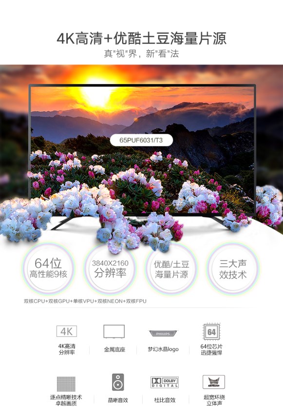 对一家人来说,每个人都有自己的喜好口味,电视最重要的,一定是要有足够的影视内容。本次促销的爆款飞利浦65PUF6031/T3电视就能给你“好看”!65吋黄金大尺寸,在家就能欣赏大场面,同时内置优酷土豆视频平台,全面覆盖电影、电视剧、综艺、纪录片、教育、音乐、体育……每周持续上新精彩内容,想看的几乎全都有!