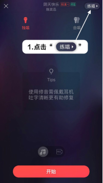 进入歌曲页面后,在右上角即可看到“练唱”按钮。点击“练唱”,正式进入练唱环节,但要注意的是,此时请务必佩戴耳机。