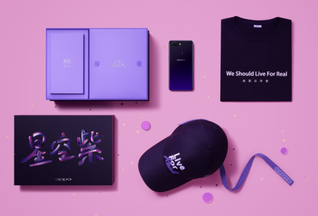 OPPO R15星空紫礼盒表面“星空紫”三个大字都采用了紫色渐变设计。盒子内部,一顶迪丽热巴、王一博同款飘带棒球帽、一件态度潮T以及一部OPPO R15星空紫。