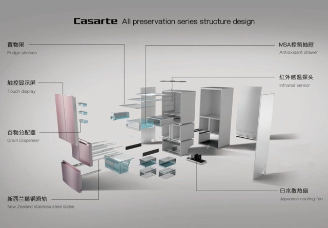 例如,一台卡萨帝冰箱,融合了来自新西兰的3节精钢滑轨、来自日本的散热扇、来自巴西的气悬浮无油压缩机等全球零部件;一台卡萨帝洗衣机,集中了来自新西兰的斐雪派克变频直驱电机、来自意大利的7寸TFT精显触控屏;一台卡萨帝空调,整合了SY韩国设计团队的空调外壳结构、日本欧姆龙、日本三菱电器模块,还有日本三菱蒸发器、美国阿波罗的加湿模块……每一款卡萨帝家电,都集中了来自全球的顶尖工艺与制造基因。