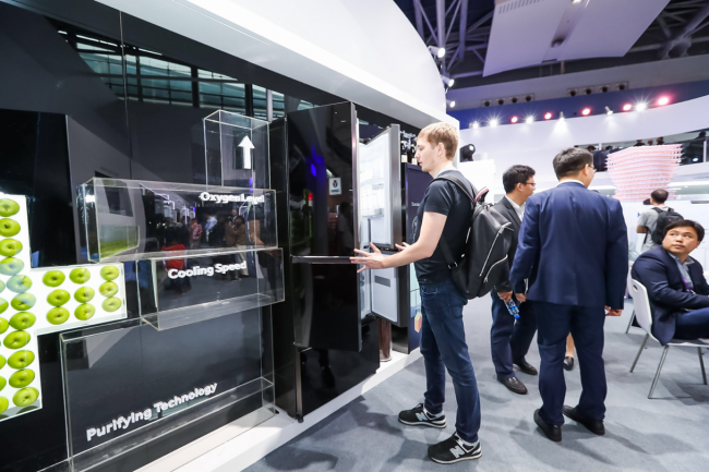 在冰箱展区,Kevin先生的目光聚焦在一台卡萨帝F+自由嵌入式冰箱上,这款冰箱独有的MSA控氧保鲜科技刷新了他对保鲜技术的认知,“我们都以为食材保鲜只能依靠低温,只有卡萨帝关注到了氧气浓度这一指标!” Kevin说,有了MSA控氧保鲜科技,北欧餐桌上常见的龙虾、三文鱼等海鲜可以在冰箱里储存更久,他表示,对于卡萨帝F+自由嵌入式冰箱在北欧市场的表现十分有信心。