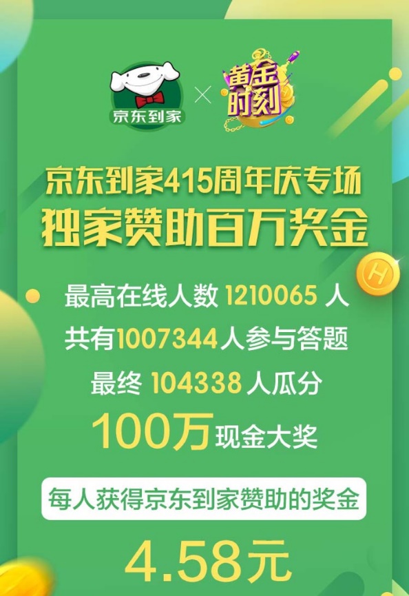 4月15日13:00,《黄金时刻》联合京东到家推出的专场直播问答顺利举行。该场直播问答在线人数峰值达到121万,最终,共有104338人瓜分了最终100万的现金大奖。